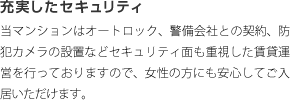 - 宅配ボックス、各部屋電子ロックキー、エレベータ非常時24時間有人会話等の最新設備満載